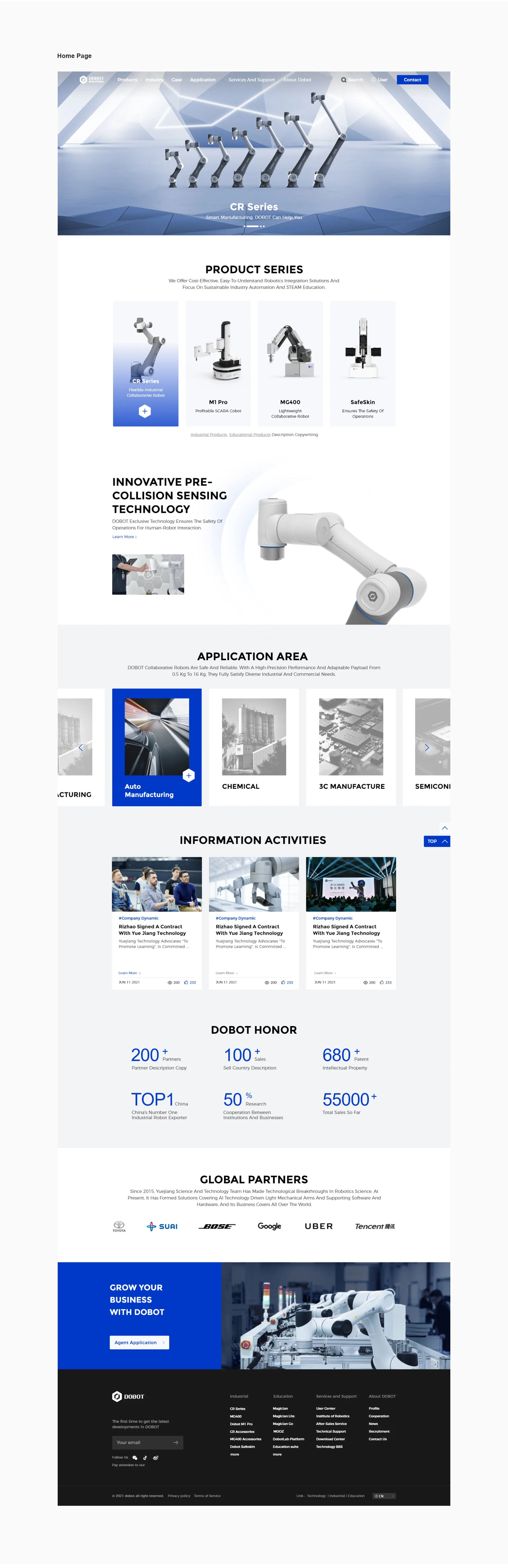 網(wǎng)站采用半開放式的版式,規(guī)律中帶有靈動(dòng)的特點(diǎn),與機(jī)器嚴(yán)謹(jǐn)規(guī)整的同時(shí)又是科技人員富含想象力的造物印象呼應(yīng);網(wǎng)站在細(xì)節(jié)處的處理與品牌vi關(guān)聯(lián)的比較密切,比如icon和顏色運(yùn)用,加強(qiáng)品牌印象的同時(shí),飽和度高的藍(lán)色也是一個(gè)讓人心情愉悅的顏色,網(wǎng)站輕松的節(jié)奏帶來輕松的瀏覽體驗(yàn)。