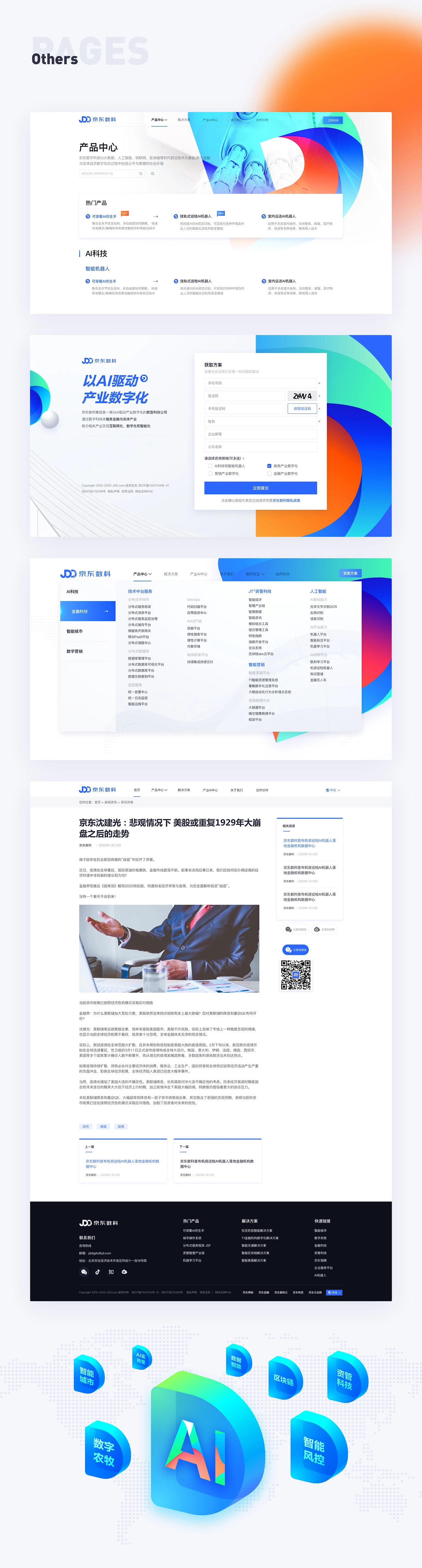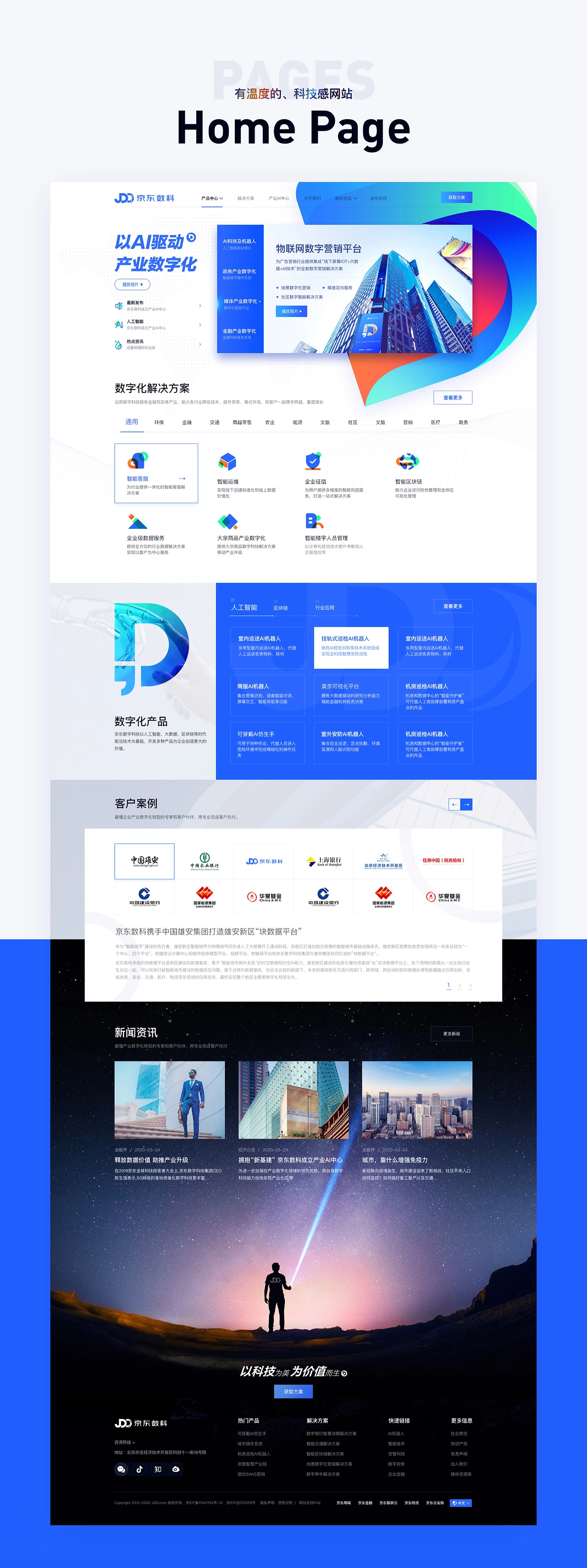 京東數字科技集團是一家以AI驅動產業(yè)數字化的新型科技公司,感恩選擇,感謝信賴,有機會能夠參與設計項目, 定位 設計一款“有溫度的、科技感官網”。基于這個理念,在腦海中摒棄了傳統的深色科技感網站的風格,決定使用白色作為背景色,在以logo藍為基調的情況下,豐富頁面的色彩,使得網頁整體給人一種時尚、輕快、明亮而又絢麗的感覺。 感謝京東市場推廣部合作伙伴的支持和幫助!