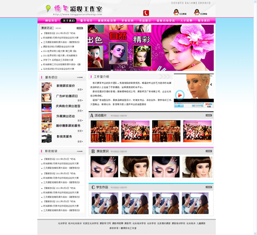 網(wǎng)站的主基調(diào)為:粉色 藍(lán)色 和白色為主,主題鮮明 彩妝工作室 突出的顏色符合行業(yè)的規(guī)則和色度!