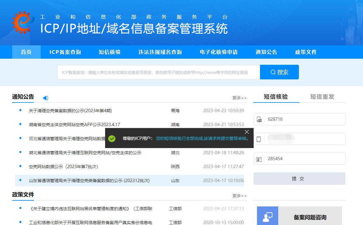 1:用戶提交的備案類型是首次新增備案時,主體負責人(法人)及網站負責人手機號驗證碼均需驗證。